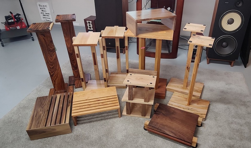 These samples of custom hand-built HiFi speaker stands (both low and tall sizes) and other assorted HiFi systems display tables and turntable bases.