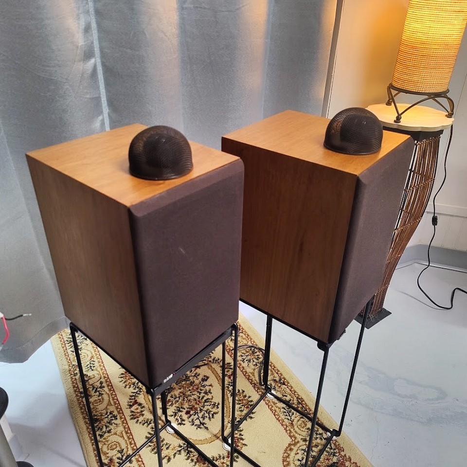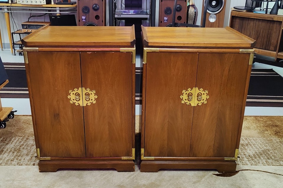 They have the desirable walnut enclosures; the unique and very rare factory stands are included.