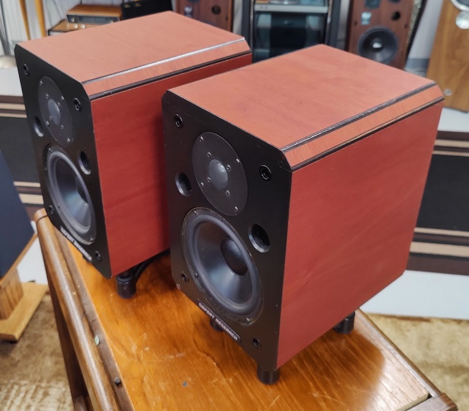 Essentially a 2-way system, these front-ported, black-lacquered grained oak, tuned-bass reflex enclosures (with radius edges) are based on the special relationship 4:5:6, which minimizes internal nodal reflections. Remarkably solid, 3/4" particle wood and high density fiberboard, plus rigid internal bracing. The narrow baffles provide excellent dispersion and enhanced imaging. They have sequential serial numbers for a matched pair.