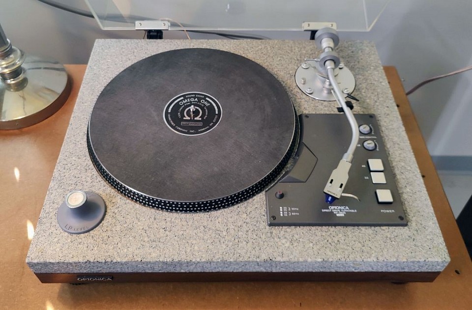 The Optonica engineers were so concerned about resonance, they even added a unique round chrome weight attached to the rear top of the proprietary dust cover. This weight keeps the dust cover solidly flat (vibration free) on the granite base during play. The turntable itself is very heavy weighing in at 35.4 pounds.